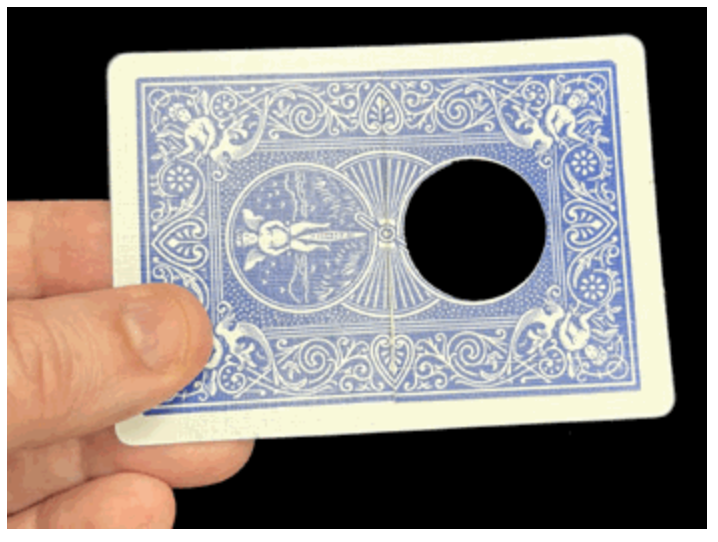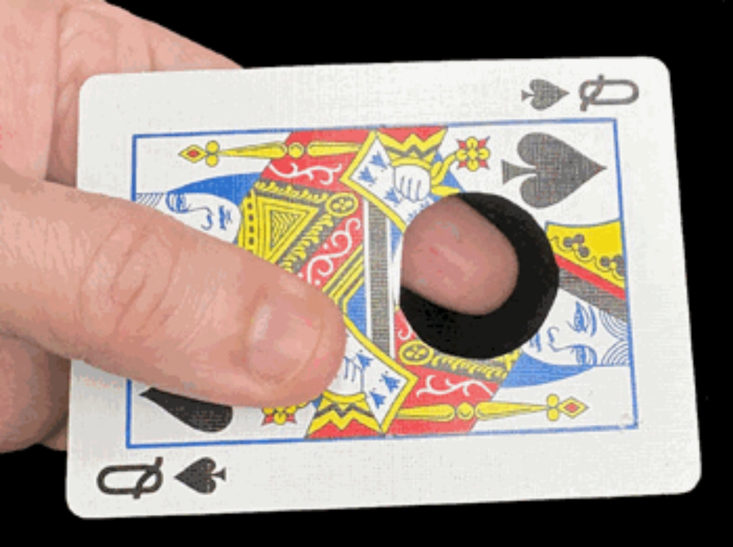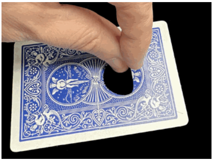 A playing card arrives with a massive hole punched clean through it—your audience can see right through and even poke a finger through.