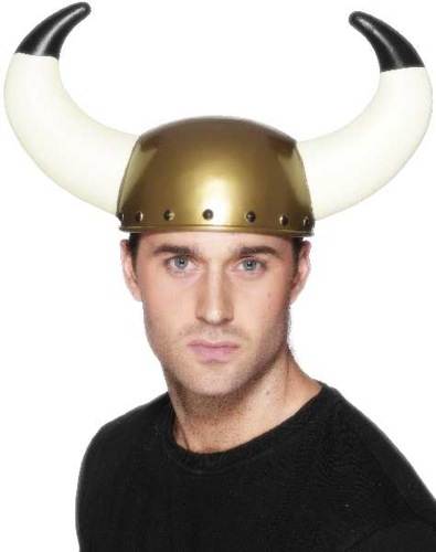 Casco de plástico marrón dorado con cuernos y detalle de borde de remache.