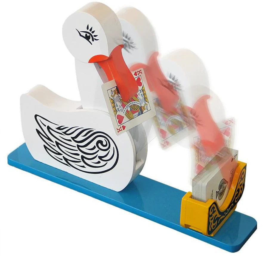 The Educated Duck is a mechanical wooden duck, which picks out selected cards from a shuffled deck, placed in its feed box. This is an excellent comedy prop, and to enhance the entertainment the duck can be blindfolded.