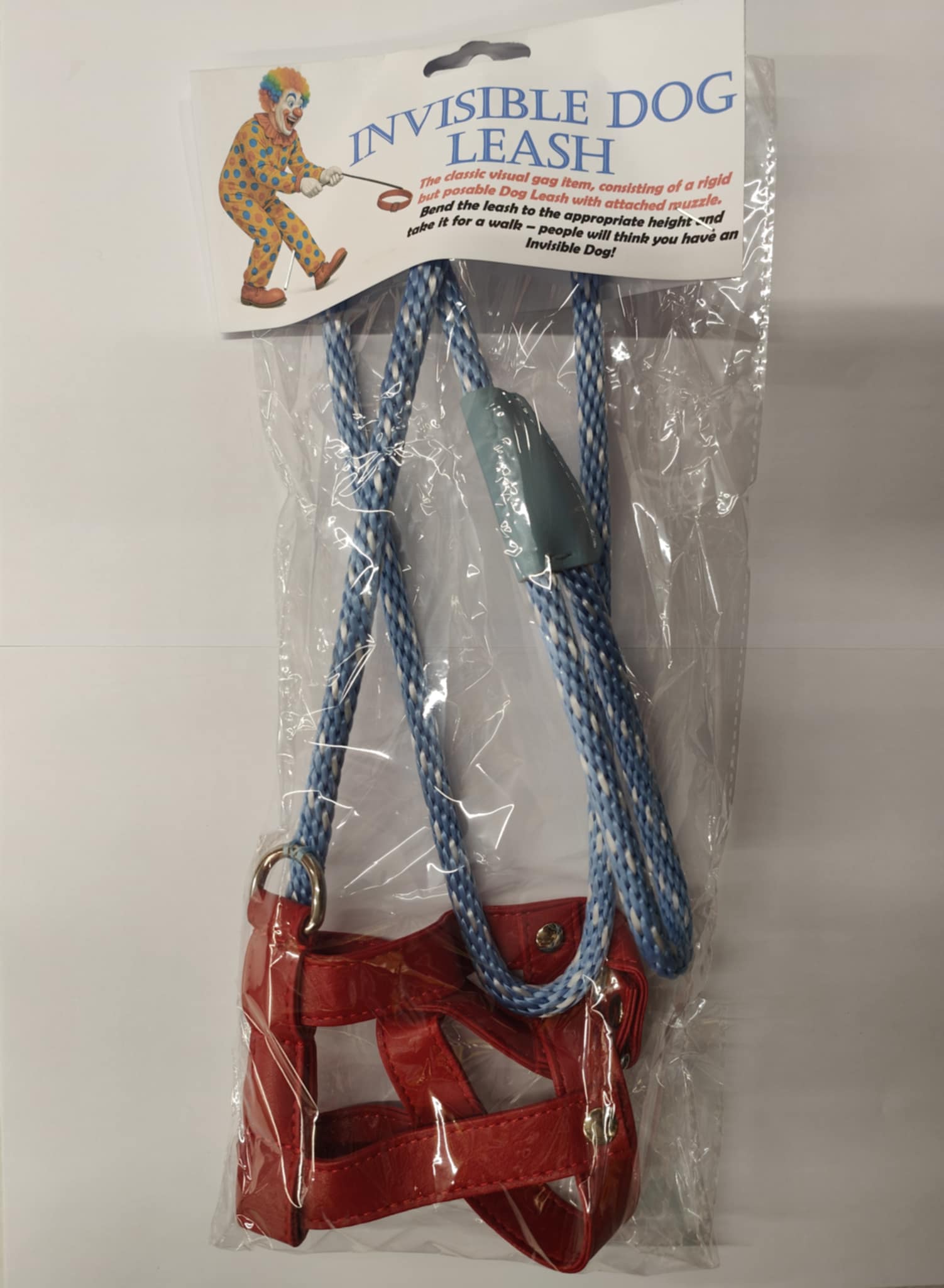 Consists of a rigid but posable Fake Dog Leash with attached muzzle. Bend the leash to the appropriate height and take it for a walk!