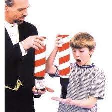 The Magician displays two yellow tubes and two bottles. He gives one each to the spectator and takes the others himself. He asks the spectator to copy his moves exactly as he puts the tube over the bottle and then holding the tube in both hands turns it over and over several times.